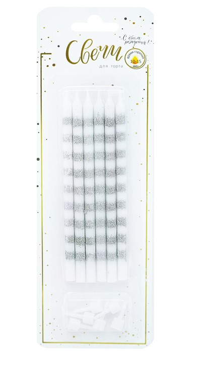 —Свечи тортовые классические 'Гиганты' Полоски серебро с глиттером с держателями, 620212